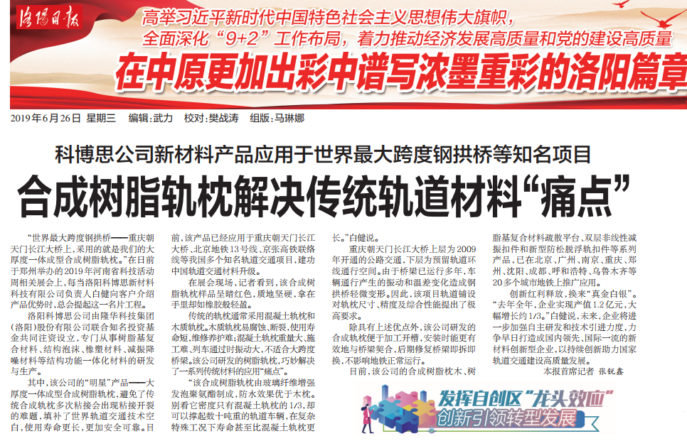 官宣:合成樹脂軌枕解決傳統(tǒng)軌道材料“痛點”-----洛陽科博思新材料科技有限公司接受《洛陽日報》專訪